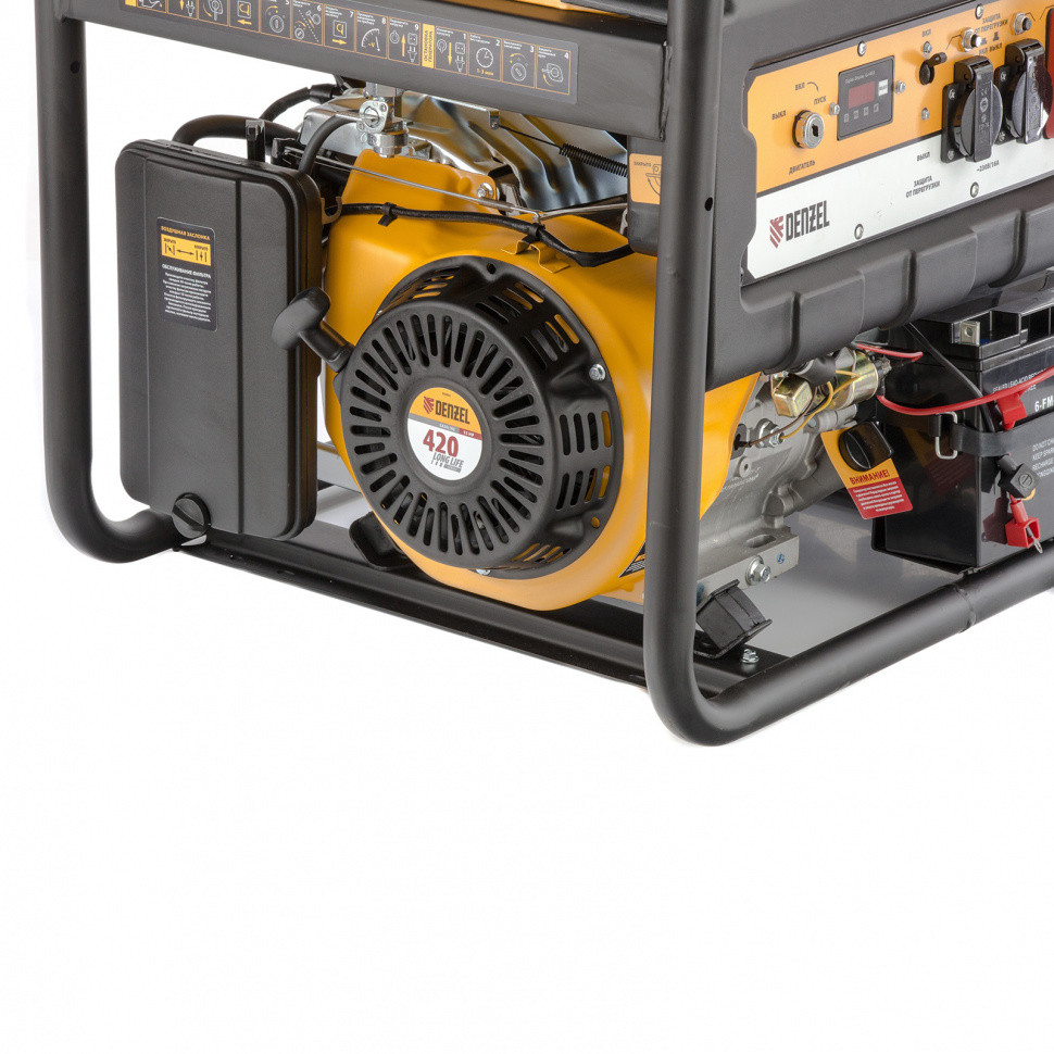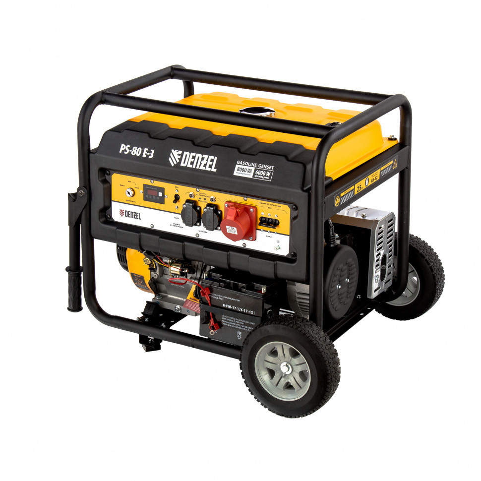 Генератор бензиновый Denzel PS 80 E-3 946954 с топливным баком объемом 25 л, с электростартером, используется в качестве резервного источника питания для снабжения однофазным или трехфазным током различного оборудования суммарной мощностью до 6,6 кВт. Подходит для использования как в загородном доме, так и на строительной площадке. Детали 4-х тактного бензинового двигателя Denzel Long Life выполнены из качественных материалов и имеют высокую точность обработки. Благодаря увеличенному топливному баку генератор проработает без дозаправки до 10 часов.