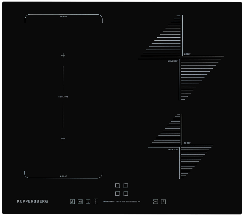 Индукционная варочная панель Kuppersberg ICS 614 оснащена четырьмя конфорками с возможностью кратковременного увеличения мощности Booster. Две левые зоны можно объединить в одну Flexi zone для приготовления в посуде большого размера. Нужную степень нагрева можно выбрать одним прикосновением к цифровому дисплею. Функция Stop&Go позволяет поставить все работающие режимы на паузу, чтобы протереть поверхность.