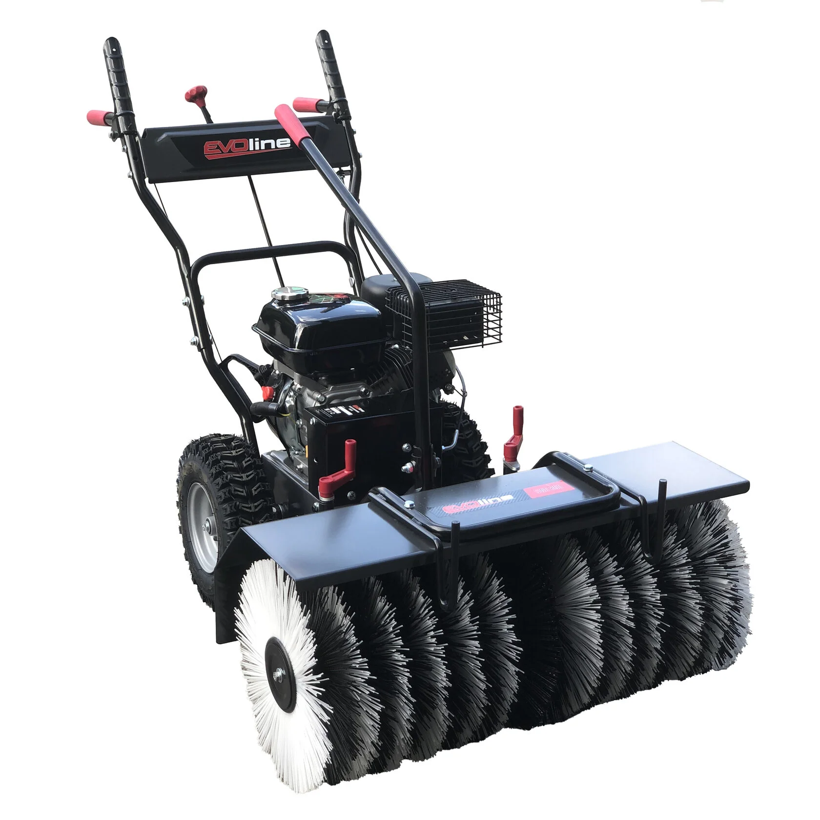 Максимальную производительность обеспечивает бензиновый двигатель Zongshen мощностью 6,5 л.с., который запускается с помощью ручного стартера. Щетки устанавливаются на подметальную машину EVOline SWG 800 очень быстро без применения дополнительных инструментов, рабочая ширина составляет 80 см. Крупные колеса с протекторным рисунком способствуют легкому продвижению машины по разным типам местности.