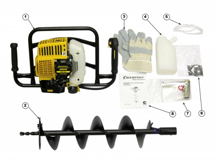 Мотобур Champion AG243 снабжен 2-тактным двигателем внутреннего сгорания, работающим на бензине, октановое число которого должно быть АИ-92 или АИ-95. Предназначен мотобур AG243 для выполнения всех видов работ, которые связаны с бурением почвы и льда, а именно, бурение отверстий в земле под столбы, сваи, под саженцы деревьев, бурение лунок во льду специальными шнеками для бурения льда. Диаметр получаемых отверстий, как в почве, так и во льду, может быть совершенно разным, начиная с 80 мм и доходя до максимально возможных 150 мм. Зависят они от диаметра поставленного шнека. В комплект поставки входит шнек диаметром 150 мм. Металлическая рама конструкции имеет по обе стороны удобные рукоятки с антивибрационными накладками. Все управляющие рычаги в легкой доступности руки, что создает пользователю простоту и комфортность использования инструмента.