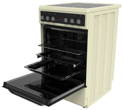 Электрическая плита Haier HCX-5CDPC1 — отличный выбор как для квартиры, так и для частного дома. Цвет корпуса бежевый, он гармонично сочетается с мебелью и техникой похожих оттенков, а также может интересно выглядеть на контрасте с ними. Для управления используется удобная и понятная электронно-механическая система. Благодаря ей выбирать режимы приготовления и настраивать параметры температуры очень просто. Основная информация о процессе отображается на дисплее. Переключатели не только выполняют техническую функцию, но и поддерживают общий дизайн; тип элементов: поворотные.
