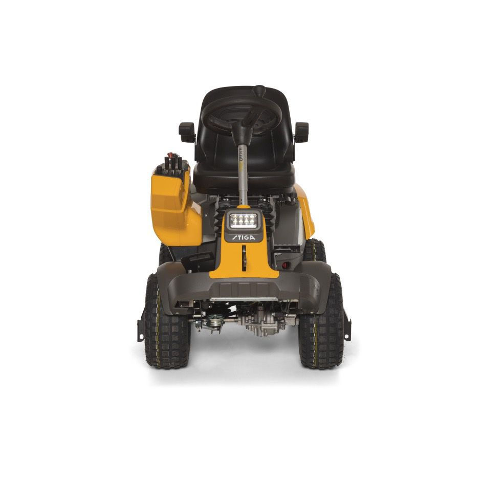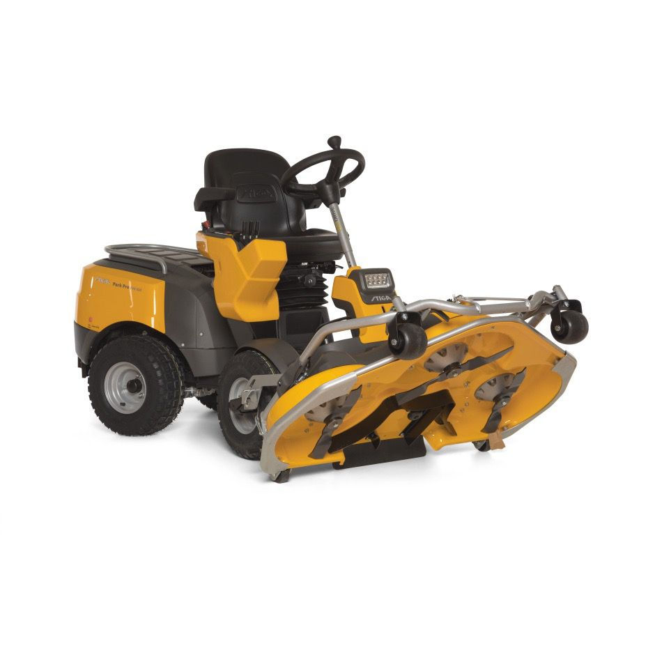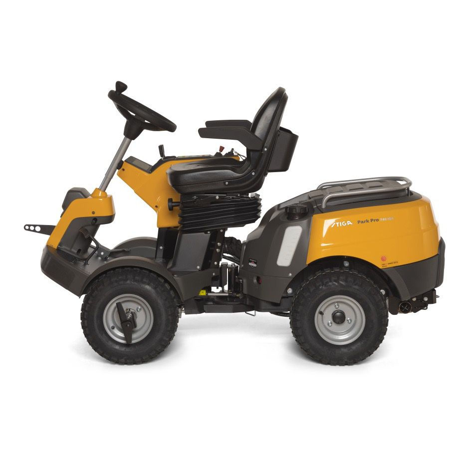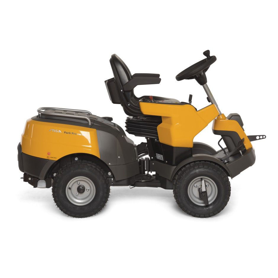 Практичный садовый райдер Stiga Park Pro 740 IOX беспроблемно эксплуатируется в темноте благодаря ярким светодиодным фарам. Для регулировки положения фронтальной оснастки применяется гидравлический подъемный механизм. Боковая панель управления имеет дисплей, на котором отображается счетчик моточасов и основные рабочие параметры мини-тракторе. Здесь же находятся кнопки электрической настройки высоты стрижки и включения фар. Запуск двигателя осуществляется с водительского сиденья с помощью встроенного аккумулятора на 12В.
