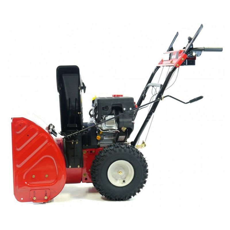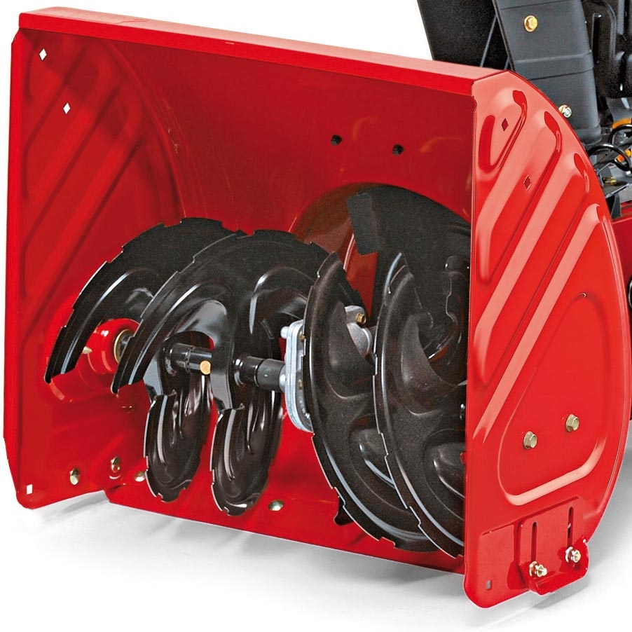 Двухступенчатая система шнеков обеспечивает эффективную обработку даже слежавшегося снега и легкой наледи. Стальной зубчатый шнек собирает снег, измельчает и передает его на крыльчатку. Выброс снега производится через поворотный разгрузочный желоб (угол поворота 180 градусов), управлять которым можно при помощи специального рычага. Дальность выброса снега может достигать 12 метров.
