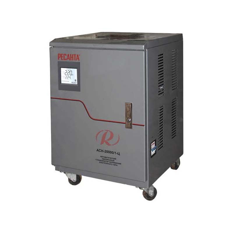 Стабилизатор напряжения Ресанта АСН 20000/1-Ц релейного типа предназначен для выравнивания входного напряжения и защиты приборов от перепадов напряжения с суммарной мощностью до 20 кВт. Работает с напряжением 220В с точностью до +/-8%. Устройство оснащено фильтрами сетевых помех, предотвращающими искажение частотной синусоиды, микропроцессорным управлением и цифровым индикатором напряжения, на котором отображаются параметры напряжения. Превышение пределов поддерживаемого входного напряжения автоматически отключает подачу питания. Прочный корпус защищает внутренние узлы аппарата от повреждений. Аппарат может обеспечить безопасную работу как любого вида бытового оборудования, включая системы освещения, отопления, кондиционирования, так и мощных электроприборов в производственных и жилых комплексах. В конструкции стабилизатора предусмотрены колеса для удобной транспортировки.