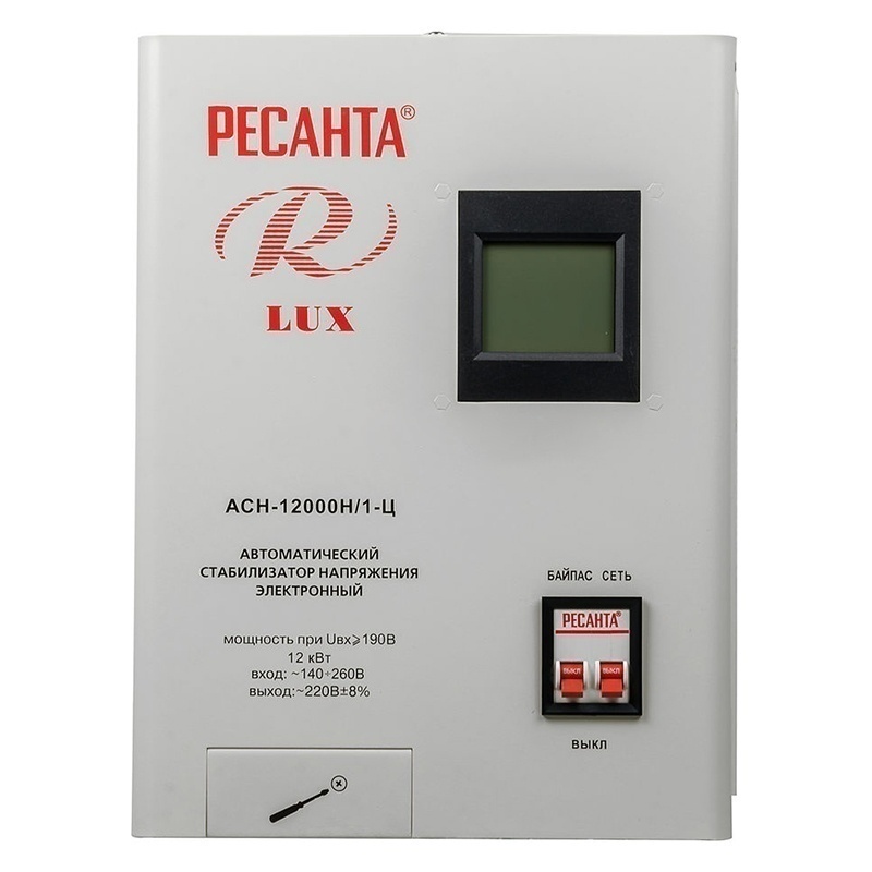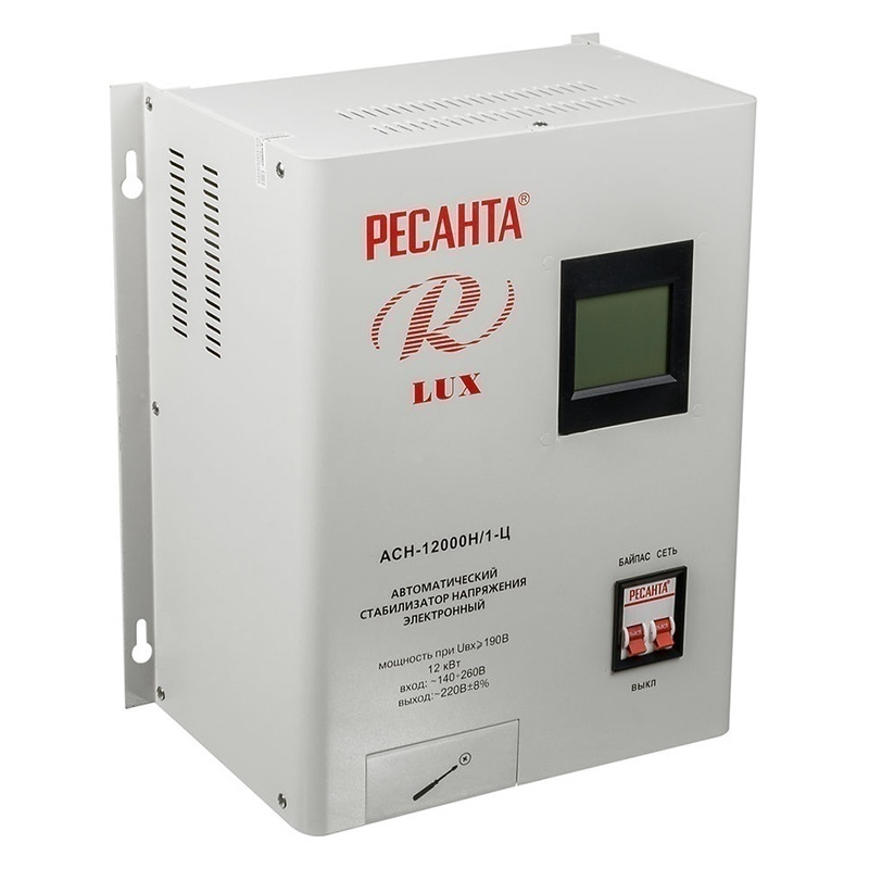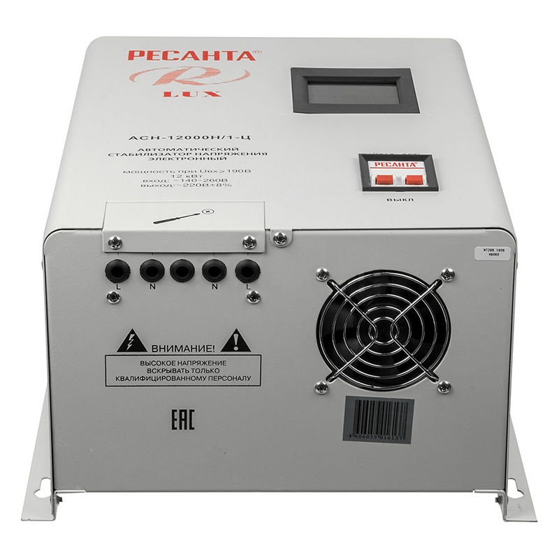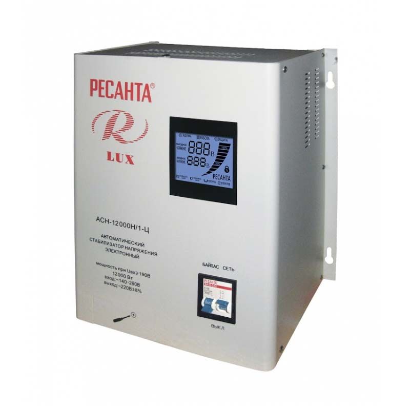 Стабилизатор напряжения серии LUX РЕСАНТА АСН-12000Н/1-Ц релейного типа предназначен для выравнивания входного напряжения и защиты приборов от перепадов напряжения с суммарной мощностью до 12 кВт. Работает с напряжением 220В с точностью до +/-8%. Устройство оснащено фильтрами сетевых помех, предотвращающими искажение частотной синусоиды, микропроцессорным управлением и цифровым индикатором напряжения. Превышение пределов поддерживаемого входного напряжения автоматически отключает подачу питания. Прочный корпус защищает внутренние узлы аппарата от повреждений. Данный стабилизатор может обеспечивать стабильным питанием - телевизор, ресивер, DVD проигрыватель, кассовый аппарат, газовый котел.