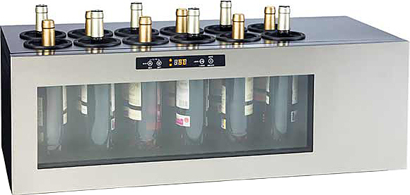 Cavanova TW02-12. Охладитель вина, размещается на столе либо на стойке бара, чтобы держать бутылки вина охлажденные. Предназначен для хранения до 12 бутылок с диапазоном температур от 5 до 20 ° C, имеется холодная подсветка внутри. Динамичный дизайн винного охладителя позволяет очень легко вписаться в любой интерьер. Винные холодильники открытого типа используют в кейтиринге, барах, лимузинах и ресторанах. Также активно применяют на дегустациях и выставках вин.