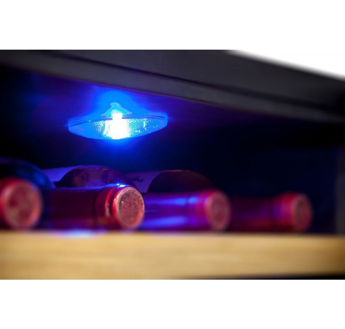 - Подсветка светодиодная синего цвета. Лампа подсветки расположены вверху зоны охлаждения.